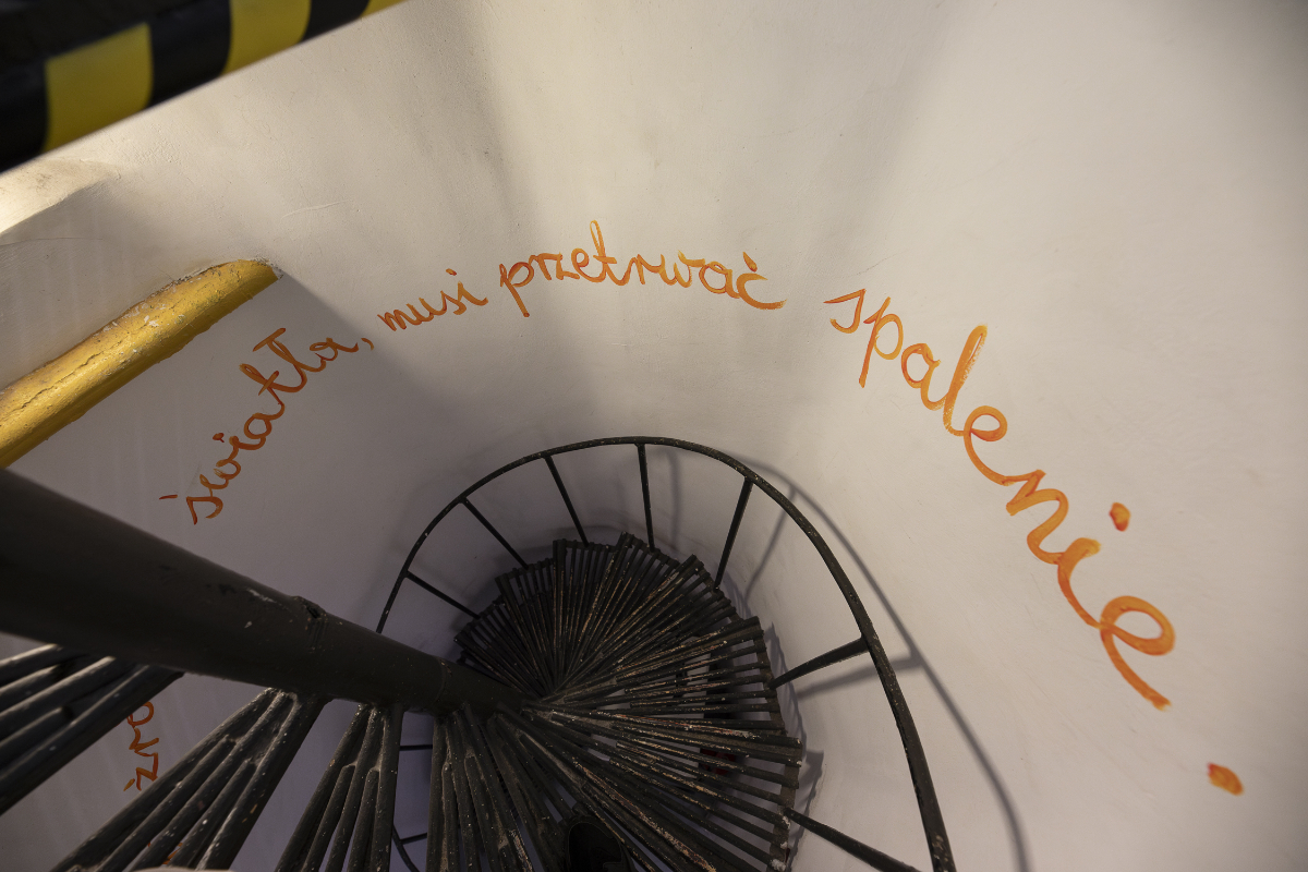 Symboliczne przejście między światem zewnętrznym a wewnętrznym stanowi klatka schodowa z muralem, na którym widnieje cytat z Viktora Frankla — austriackiego psychiatry, więźnia nazistowskich obozów koncentracyjnych: „To, co ma być źródłem światła, musi przetrwać spalenie”. Ta myśl stanowi wprowadzenie do dolnej części galerii, metaforycznej przestrzeni serca, gdzie dominują prace o introspektywnym i medytacyjnym charakterze.