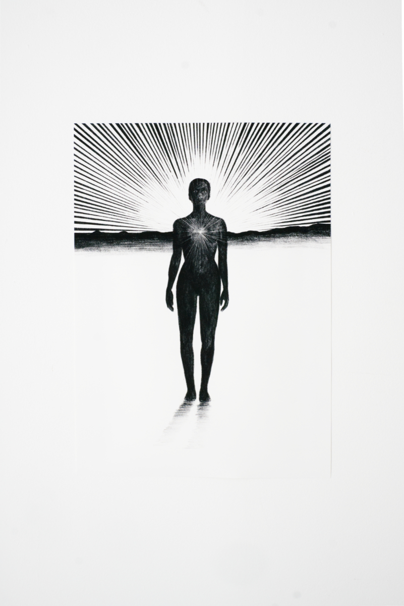 To przeniesiony w przestrzeń galerii fragment komiksu Spleen. Finalna strona jednego z opowiadań, która przedstawia nową istotę z czystym sercem, wolnym od przeszłości i związanego z nim bólu. Transformacja dokonała się przez wypalenie na popiół i odrodzenie się z niego.